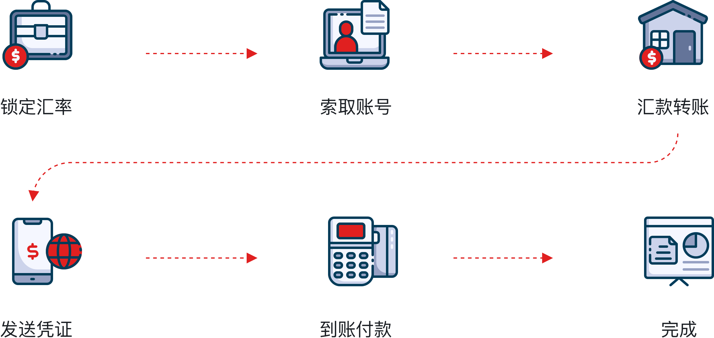 锁价流程:锁定汇率→索取账号→汇款转账→发送凭证→到账付款